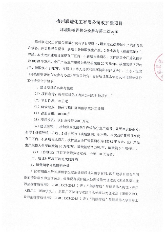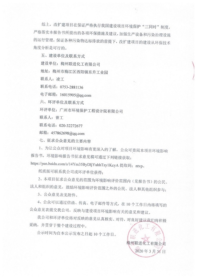 梅州聯(lián)進化工有限公司改擴建項目環(huán)境影響評價公眾參與第二次公示